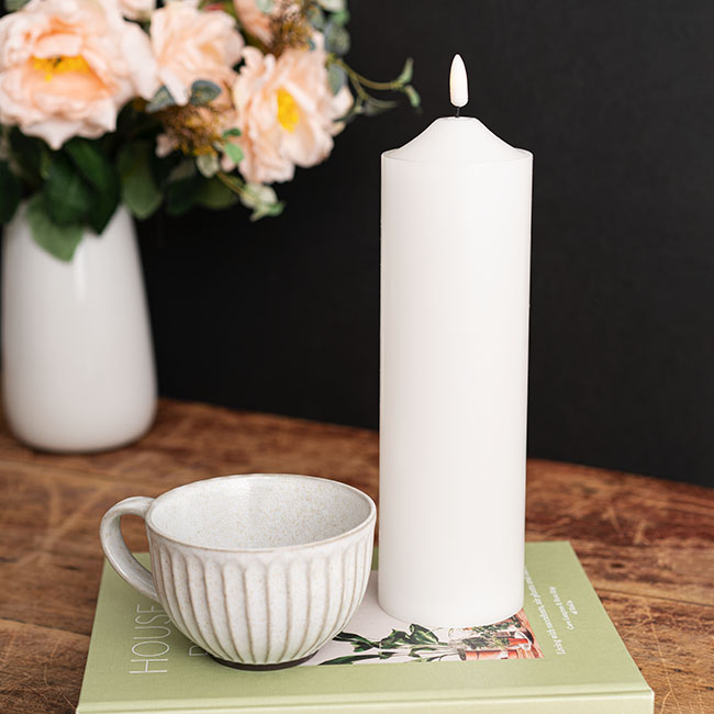 Be mesmerised by the magic of LED candles. This Trueflame™” Flickering LED White pillar candle gives a cosy ambience like a real candle. It is a safe alternative to decorate your home, weddings and any special events. Featuring real wax, long battery lighting life and a realistic flameless glow.
