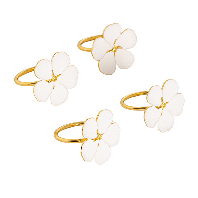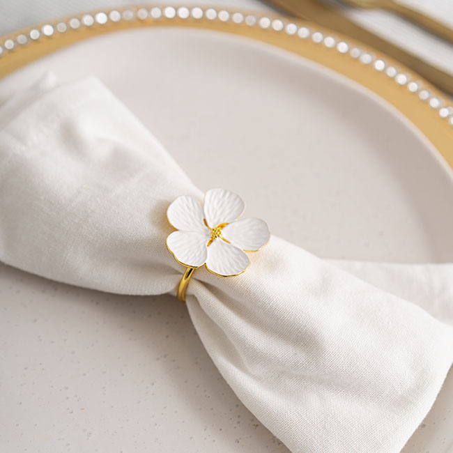 This napkin ring is available in a pack of four and is also available in chrome gold. This napkin ring measures 40mm in diameter, with the inner diameter measurring 34mm. The decorative flower measures 42mm in diameter.