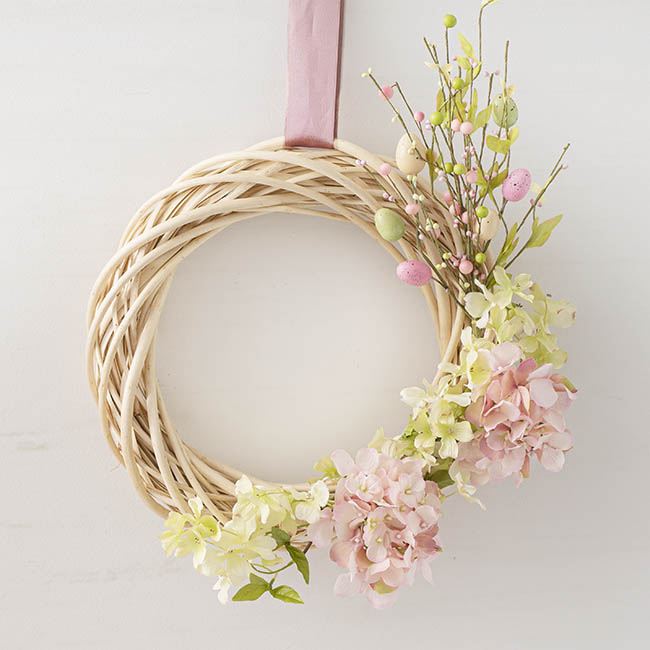 Measuring 40cm in diameter this Willow Wreath is made from entwined rattan and is a light brown colour. Floral pieces, ribbons or your favourite ornaments can be added to the wreath to create a spectacular holiday welcome wreath, a tablescape or venue decorations. The thickness of the wreath itself is 8 - 8.5cm wide.