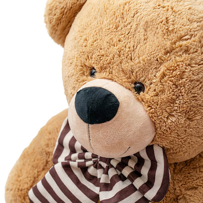 Cloaked in a rich brown fur coat, Wilson is adorned with a large, charming brown and white striped bow that adds a touch of whimsy to his classic appeal.