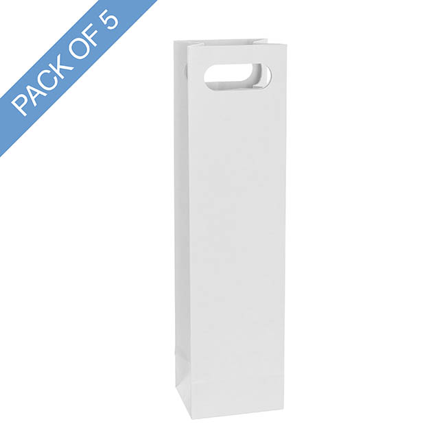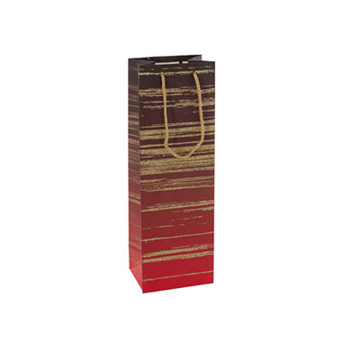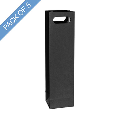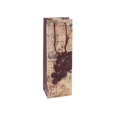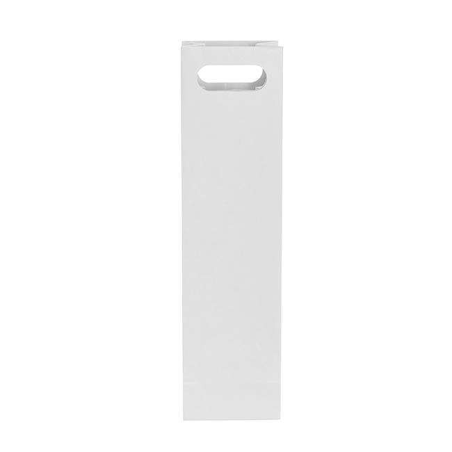 This bag measures 11cm wide, 9cm deep, and 42cm tall, and can contain up to one bottle of wine. The front and back handles are 7.3cm wide and 2.8cm high. The handle sits 2cm from the top with a space of 37cm below the handle and the handle is 1.7cm from the edge of the bag.
