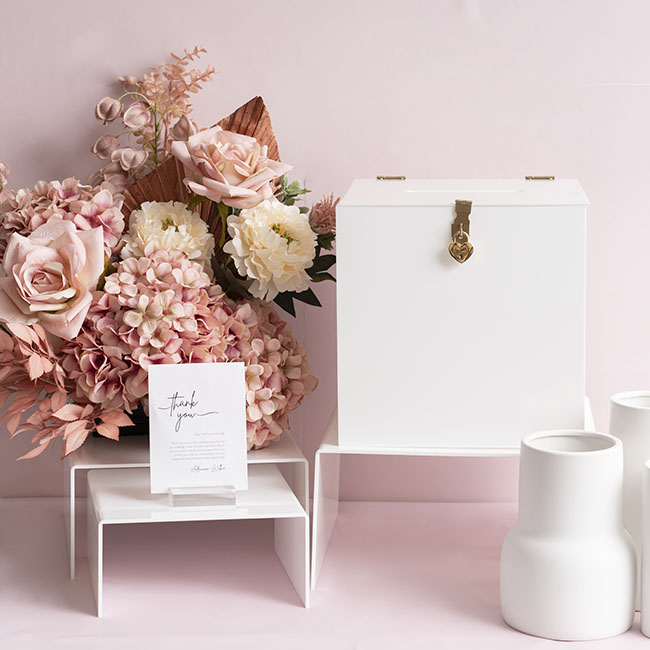 Both the lock and key are heart-shaped; which is a particularly fitting detail for wedding use. Measuring 30cm x 30cm x 30cm. Card slot area is approximately 14.8cm x 2cm. The card slit measures 2cm wide and 15cm long. This product is sold individually. This product is also available in clear and black.