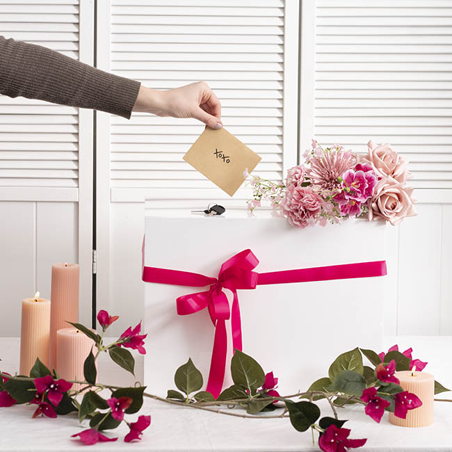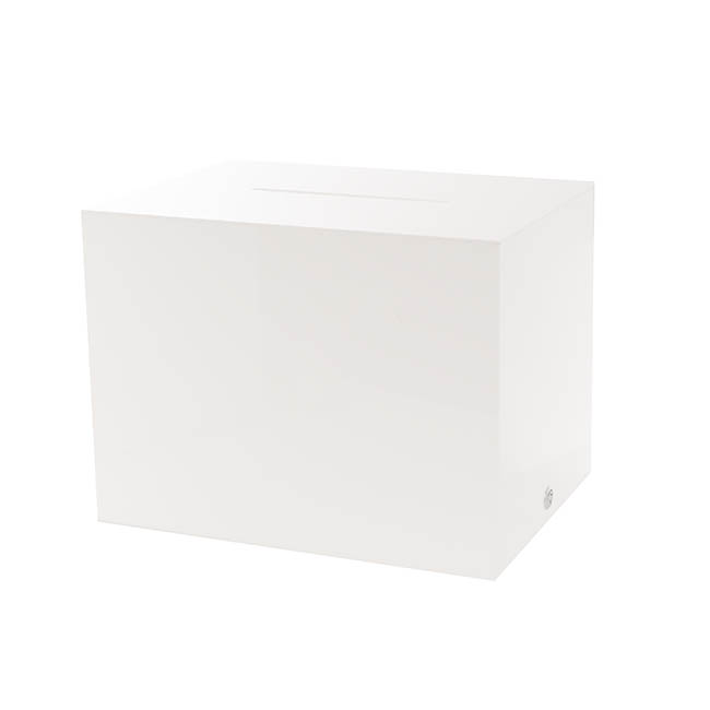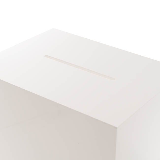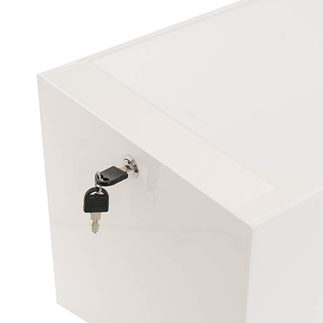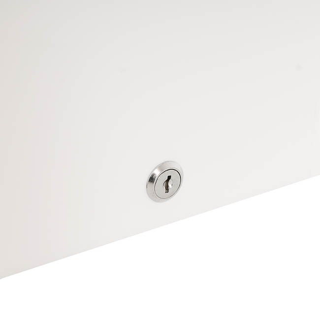 This wishing well measures 40cm in length, 30cm in width, and 30cm in height. Unlike other styles of wishing well, this model does not have a hinged lid at the top; this wishing well opens from the base. The envelope slit sits at the top of the wishing well and measures 1cm wide and 20cm long. This wishing well is sold individually.