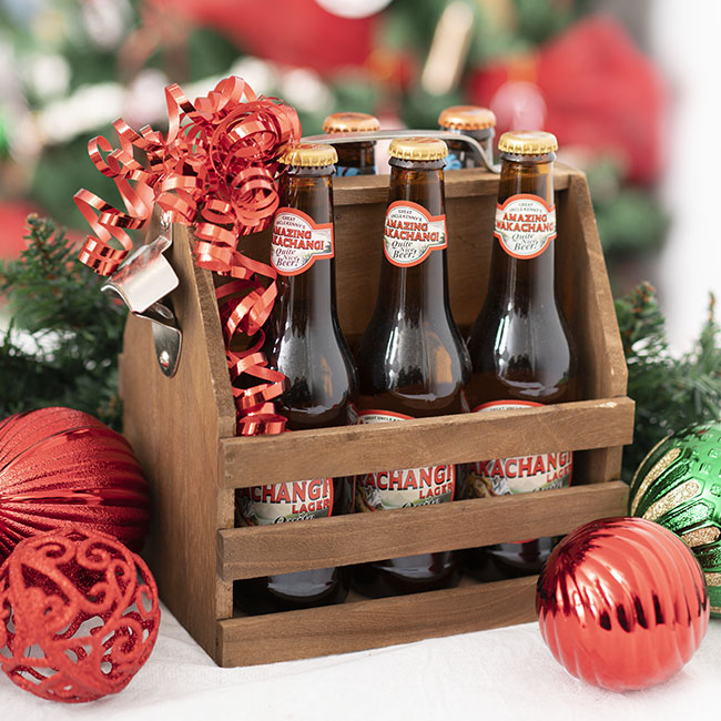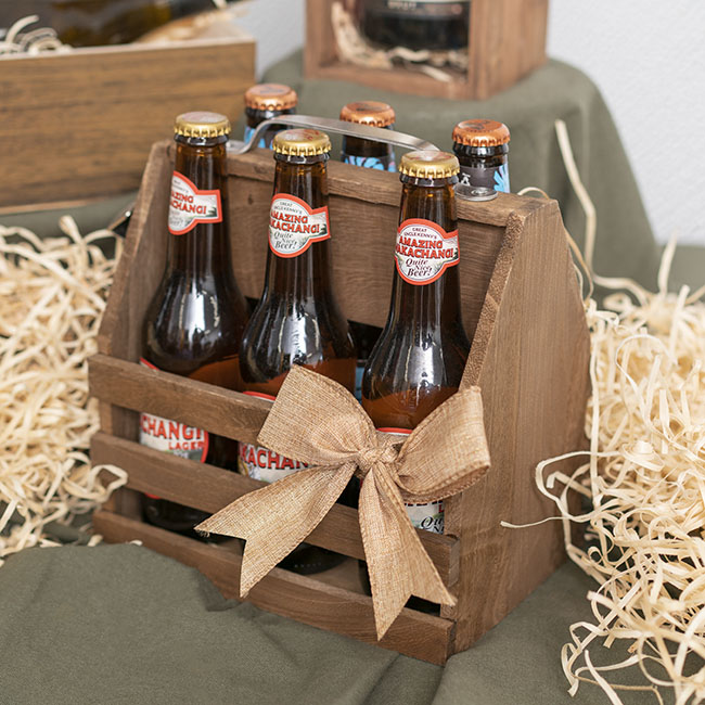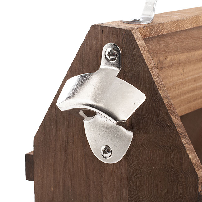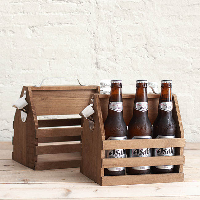 This wooden and metal beer bottle carrier is perfect to hold your favourite bottles of beer in style. It comes with a metal handle and opener on the side and can hold up to 6 bottles of beer or 6 soda cans; ready for wherever you go. This is a great gifting idea for all beer lovers. The carrier has a rustic natural finish and the inside base measures at 19.5cm long and 14cm wide.