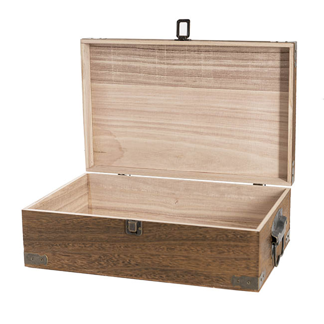 This Antique-style Double Wooden Wine Box includes features which include a hinged lid, locking latch, metal handles, and metal detailing on the corners. With a brown stain finish on 8mm real timber, the box has a sturdy feel and is smooth to the touch.