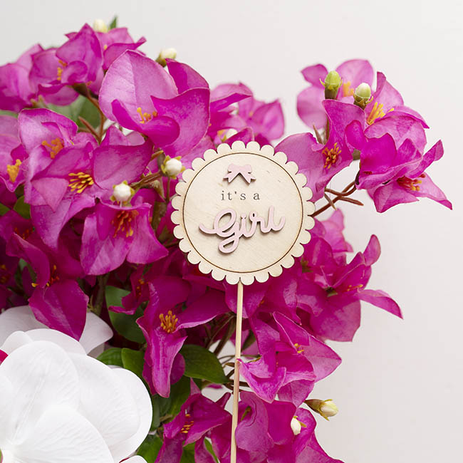 Celebrate the arrival of a little one with this charming wooden pick, measuring 32cm tall and featuring the sweet message “It’s a Girl.” Perfect for decorating floral arrangements, gift hampers, cakes or event displays, this simple yet stylish pick adds a warm, celebratory touch to baby showers and newborn celebrations. Sold in packs of 12, it’s ideal for both personal use and larger events.