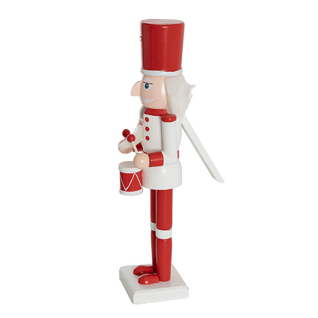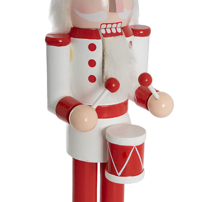 This nutcracker wears a red and white uniform, complemented by a matching drum. Constructed from wood, this nutcracker is perfect for display on mantels, shelves, or entryways, bringing a traditional and cheerful touch to your Christmas decorations.