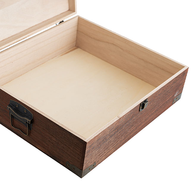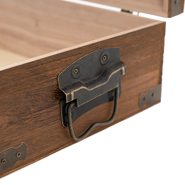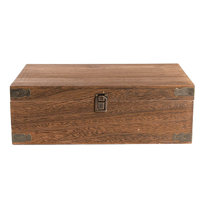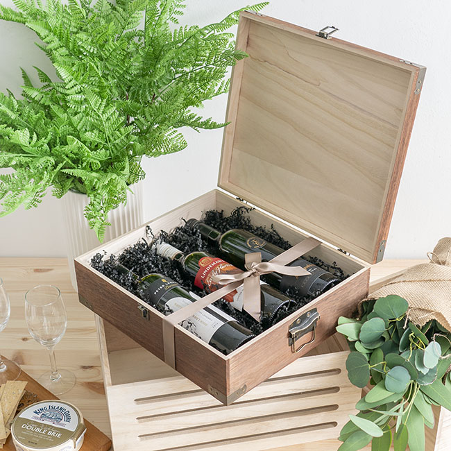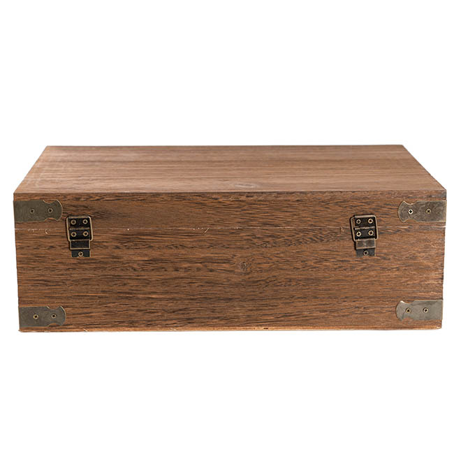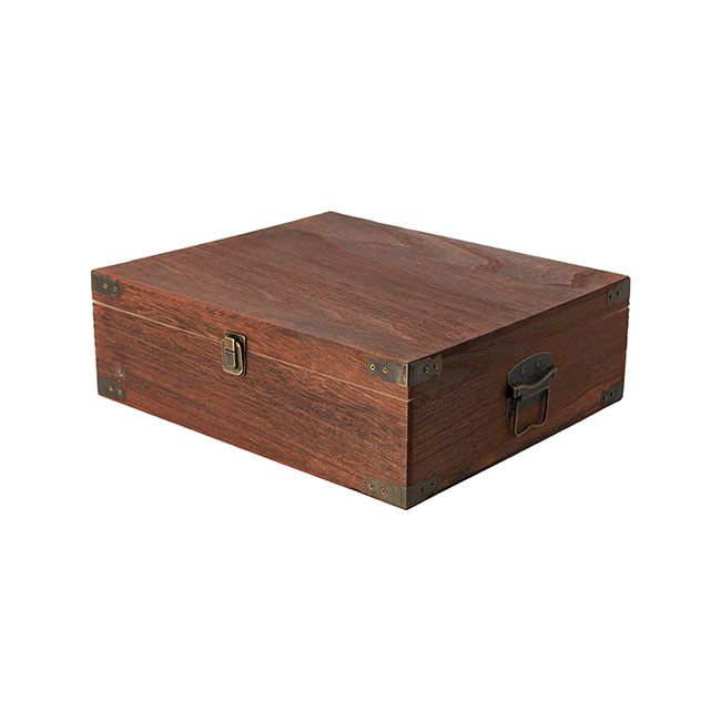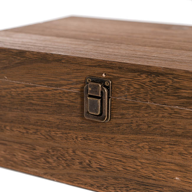 This Triple Wooden Wine Box in Antique Brown has a rustic, antique look. Complete with a hinged lid, locking latch, metal handles and metal features on the corners, this box has a brown stain and smooth polish finish on 8mm real timber.