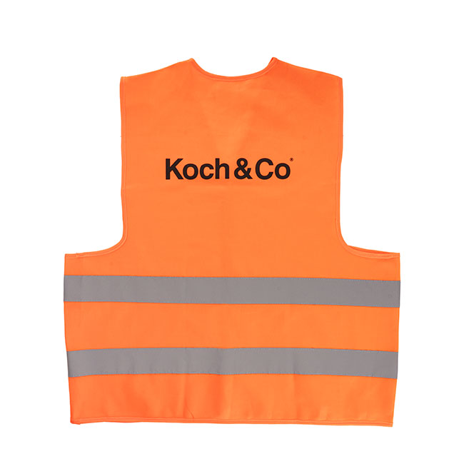 This vest is a High-Visibility Safety Garment for Day or Night use, to be worn over clothing. This Orange vest is XLarge 66cm x 70cmHigh, and features the Koch & Co. logo on the back.