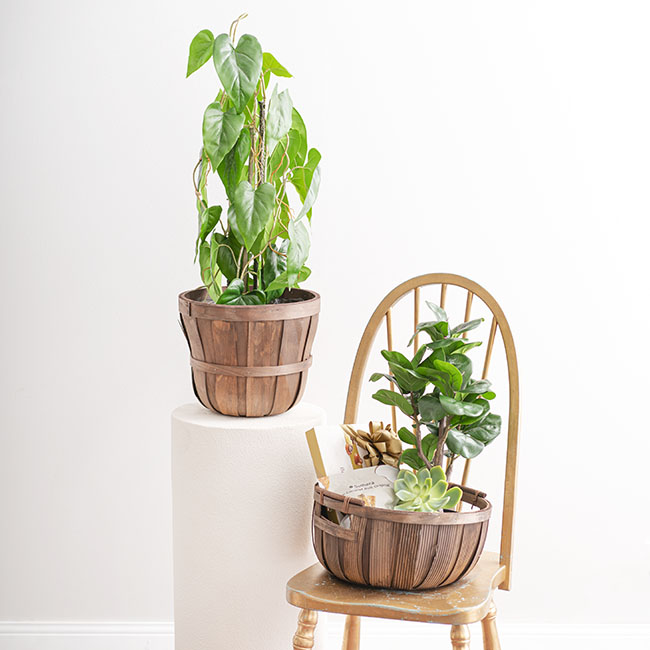Made from thin sliced natural wood chip making it lightweight. Basket measures 30cm in diameter and 25cm in height. Base measures 15cm in diameter. Available in 2 colours.