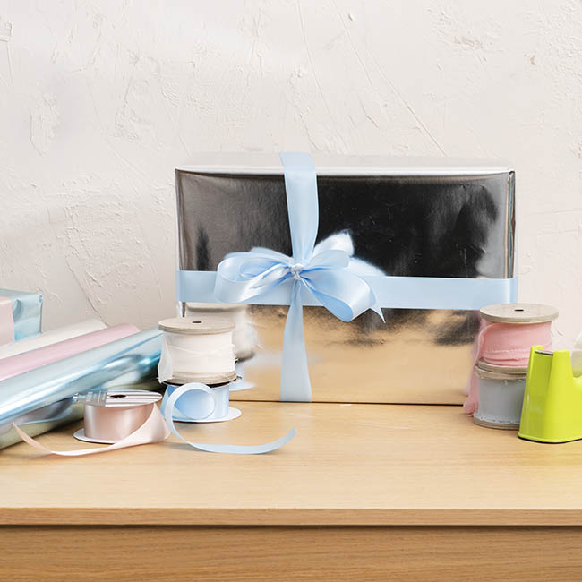 This paper is unique in that it is a metallized paper. That is, paper is coated with a layer of pure aluminium, and then a semi-gloss finish. This finish provides decorative and protective properties to this unique wrapping paper. This wrap features white backing.