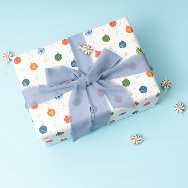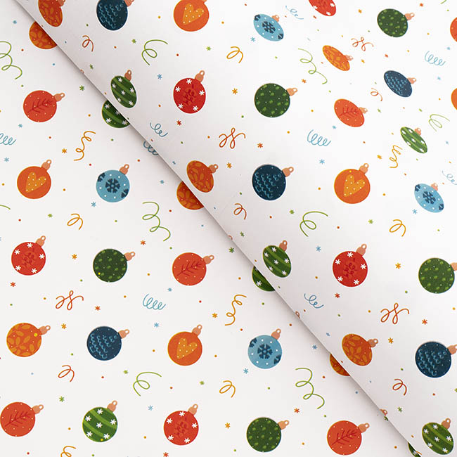Our fun Christmas Bold Baubles Gloss finish Wrapping Paper Roll in bright colours is printed on White. Well-suited to giftwrap for recipients of all ages, this is a particularly family-friendly print. Use this wrap in the home or for in-store retail wrapping.