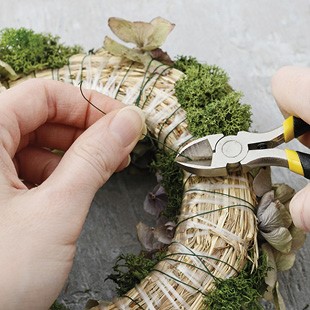 5. Start attaching flowers one by one onto the twine using binding wire. Keep in mind to start at one end and work your way around.