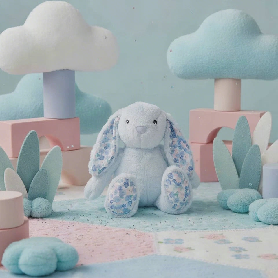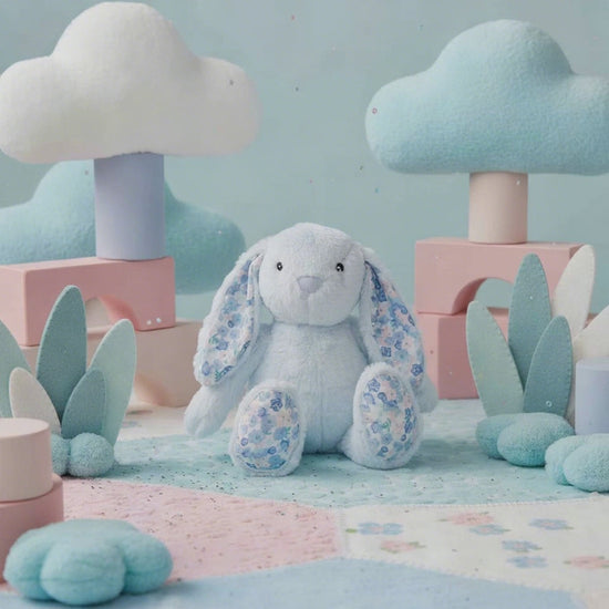 Lucy is the Soft Blue Plush Soft Toy Bunny that's full of charm and perfect for cuddles. With delicately stitched eyes and irresistibly floppy legs, Lucy brings a timeless, handmade feel to any nursery or gift basket. Her floral-patterned ears and feet add a touch of whimsy and sweetness, making her a lovely companion for little ones.