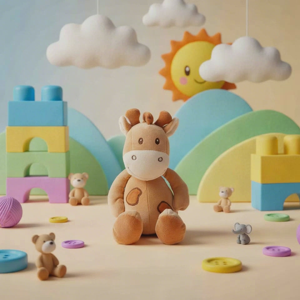Colby Giraffe is the coolest animal in the jungle. He is made with soft Hazelnut short pile fur and embroidered details, making him safer for children under 3 years old. Colby makes a great nursery soft toy and is very popular for baby hampers. Measures 23cmH.