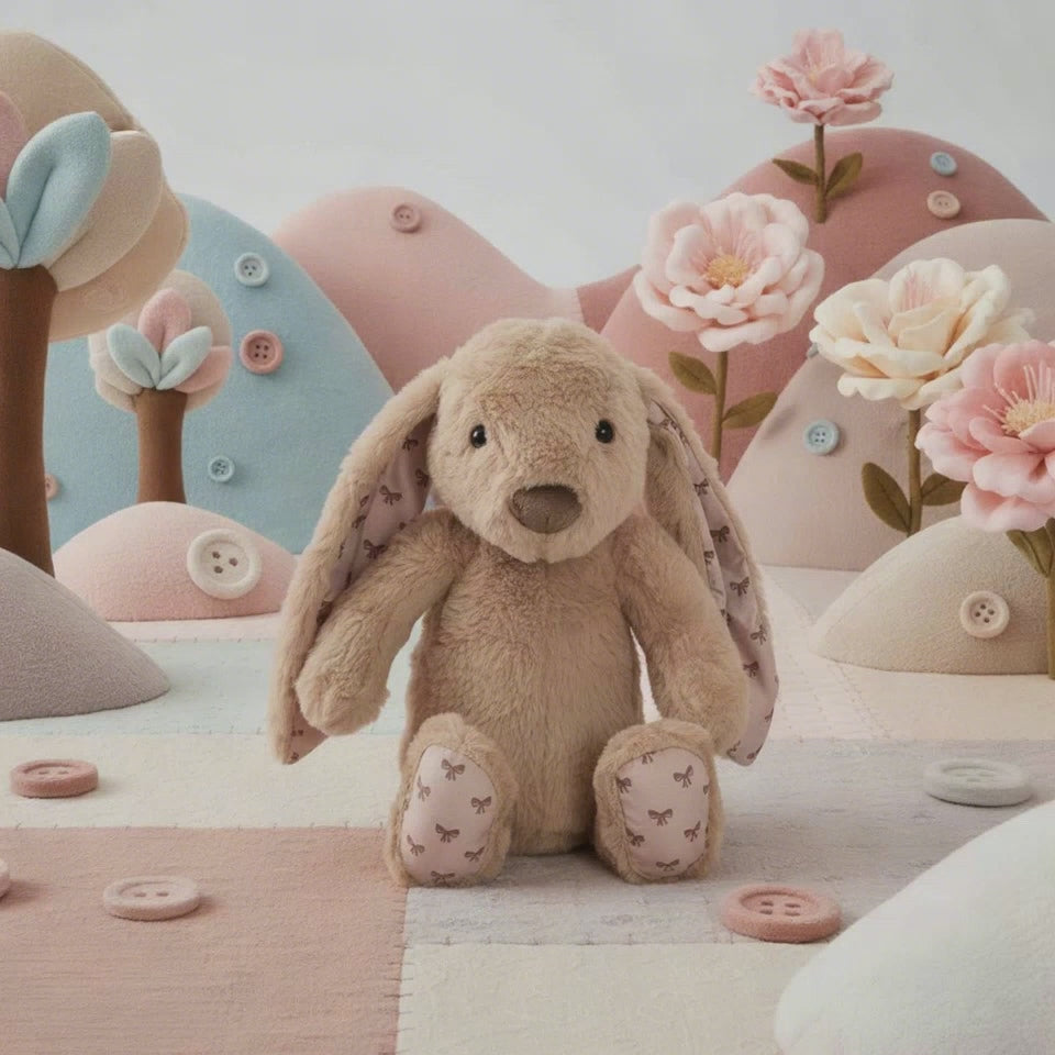 Meet Petals, an irresistibly soft bunny in a gentle soft brown hue, sitting 30cm tall and designed for extra cuddles. Featuring a charming bow pattern on her ears and feet, Petals is as sweet as she is stylish. Filled with recycled PET plastic bottles, this eco-friendly bunny is beautifully plush, lightweight, and wonderfully cuddly�perfect for gifting, nurseries, or as a comforting companion for all ages.