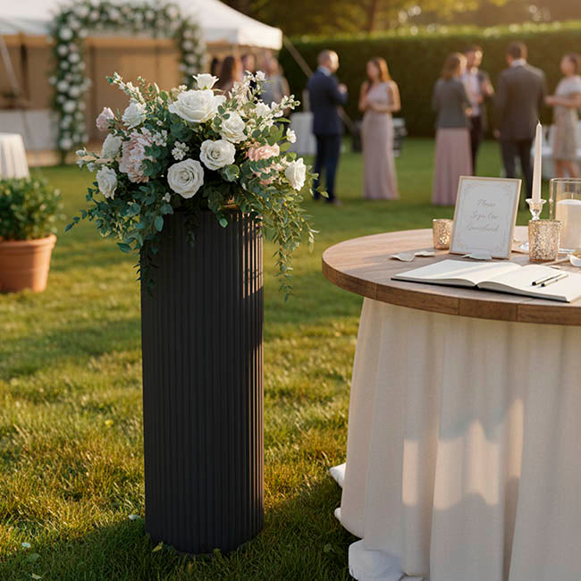 Our Fibreglass Ripple Plinth Round in Matte Black is a classical-style ribbed plinth reminiscent of ancient Grecian columns. Timeless in their appeal, these matte-finish plinths can be dressed to embrace this classical nature with an ornate urn. Alternatively, adapt them for a modernistic aesthetic by topping them with minimalistic vases, floral arrangements, and cakes. Great for events like Baby Showers.