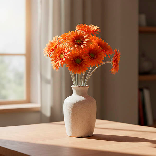 When a splash of colour is needed, use the Aztec gerberas for a bright pop. Our artificial gerberas are high in quality with a flexible stem to suit different sized arrangements and floral inspired projects. Easy to cut with a strong pair of cutters. All 6 colours available are easy to work into many themes and events. The flower head diameter measures around 10cm.