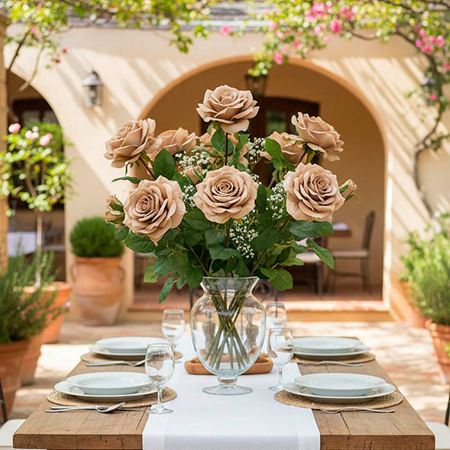 This Holland Open Head Rose Stem in Deep Nude is a breathtaking artificial rose designed to elevate any decor with its delicate beauty. Great for large scale events and floral arrangements, this stately flower is a focal flower that takes up more space than the average rose.