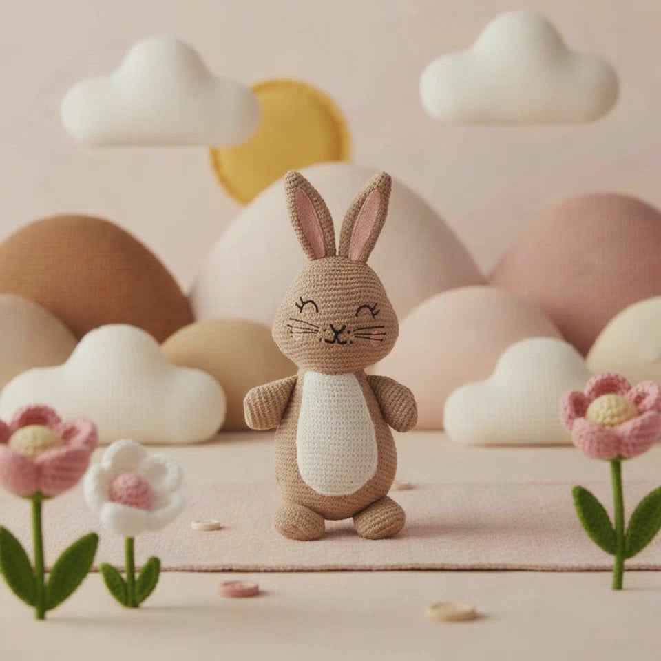 Rosie the Bunny Plush is a Brown cuddle companion made from cosy knitted fabric. With charming cheeks, ears, and fully stitched facial details, she's perfect for little ones, ensuring safety for babies. Rosie's gentle, textured design makes her a lovable friend for snuggles and playtime adventures.