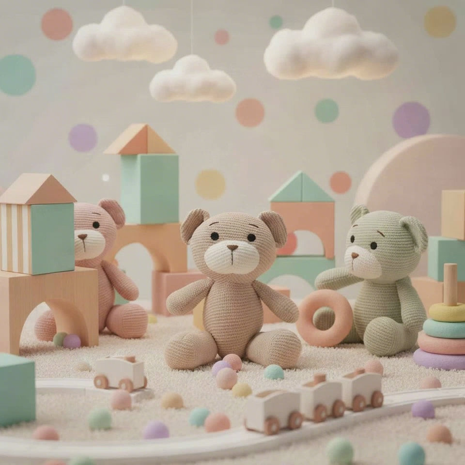 Meet Chuck, a charming teddy bear crafted from Brown knitted fabric. His stitched facial details ensure safety, while his movable legs make him the perfect companion for both play and cuddles. Chuck's timeless design and soft texture make him a delightful addition to any nursery or toy collection.
