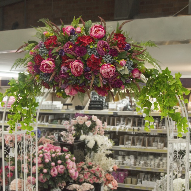 This arch has been tastefully dressed with an array of reds, pinks and greens to give it a modern and elegant look. Best used for weddings and events.
