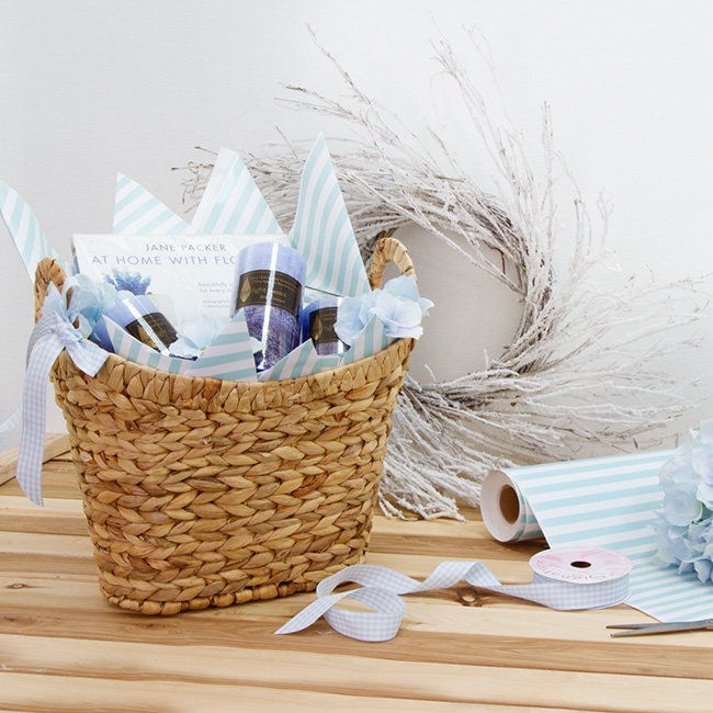 What a delightful way to present that special little gift to someone. Hyacinth basket filled with scented candles, lined with baby blue striped paper, add a few hydrangea petals, finished off with some pale blue gingham ribbon and voila.