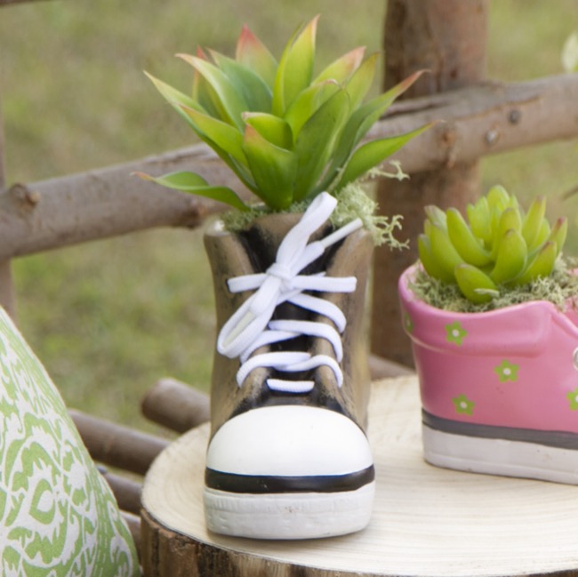 A novelty ceramic sneaker suitable for small floral displays. It measures 11.5cm high with a 6.5cm opening.