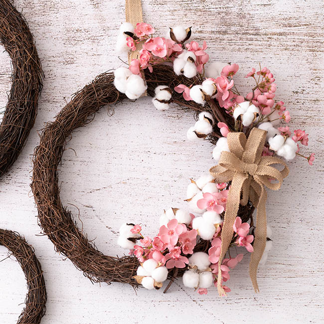 Create this stunning wreath by adding some cherry blossoms and cotton sprays and finishing off with a jute bow. Such a beautiful piece to hang on your door or wall.
