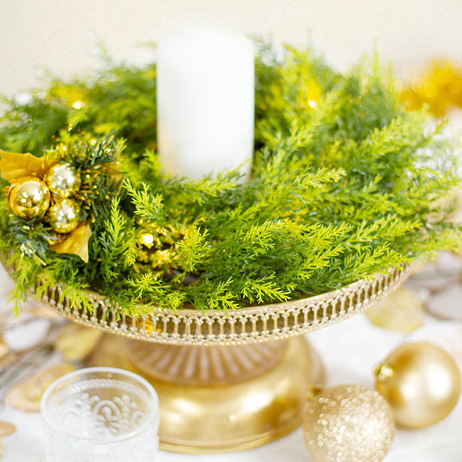 We have dressed our Cypress Wreath by adding a Christmas pick and placing it on our Gold Victoria Metal Cake stand with a pillar candle in the middle. This is a beautiful centrepiece for your Christmas table.