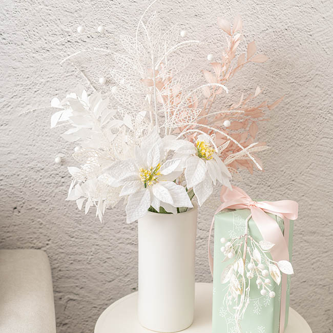 Combine shades of soft white textures with a hint of soft pink camellia leaves. Beautiful snowy white floral arrangement will look fabulous as a table centrepiece this festive season.