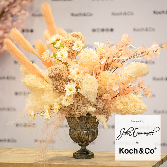 Enjoy your favourite blooms all year round with this chic dried flower urn arrangement. This vintage style centrepiece features champagne pampas grass, eucalyptus, and hibiscus flowers. This is the perfect addition to your home décor or foyer. Designed by John Emmanuel for Koch & Co.