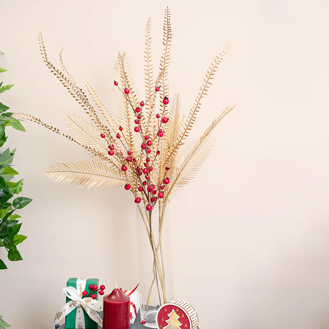 Add some glamour to your festive floral decor by mixing different dimensions and textures. We have combined our Red Berry Spray with gold metallic Feather Fern and Leaf Sprays.