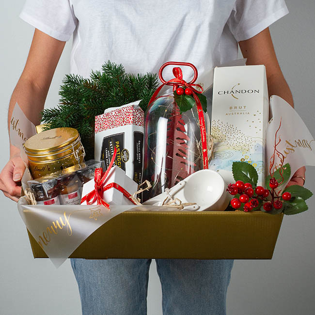 This simple hamper tray in gold with some frosted Cello paper on the base, is the perfect way to present your gifts this season.