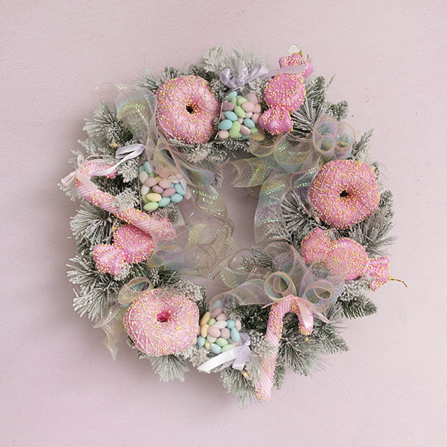 Amp up the whimsy this festive season with our snow-flocked and sprinkle-topped Iced Pink with Sprinkles: Doughnut Christmas Wreath. Sparkling with mirth and glitter, this wreath will sweetly welcome your guests when they come a' knockin' this Christmas.