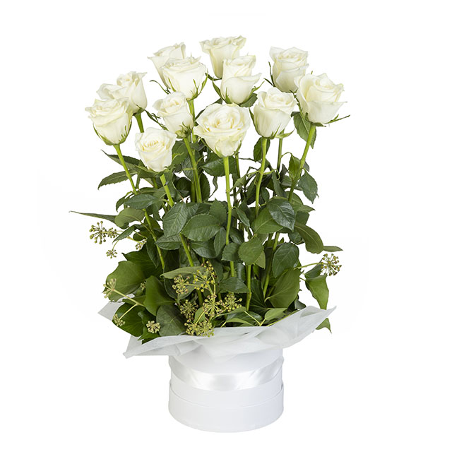 Interflora 12 White Rose Box Arrangement. Suitable for home and gifting.