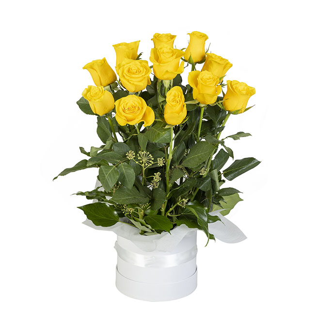Interflora 12 Yellow Rose Box Arrangement. Suitable for home and gifting.