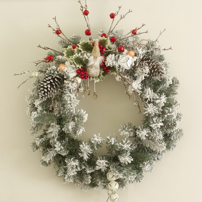 A snowy wreath can really bring out the traditional theme of Christmas. Add Christmas picks and ornaments to bring out the best in the season.