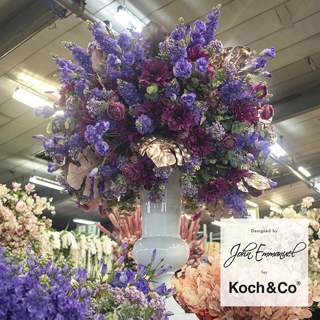This eye-catching arrangement is in full bloom with a luscious blend of purple phalaenopsis orchids and fuchsia dahlias. This delightful arrangement is suited to home decor and events. Designed by John Emmanuel for Koch & Co.
