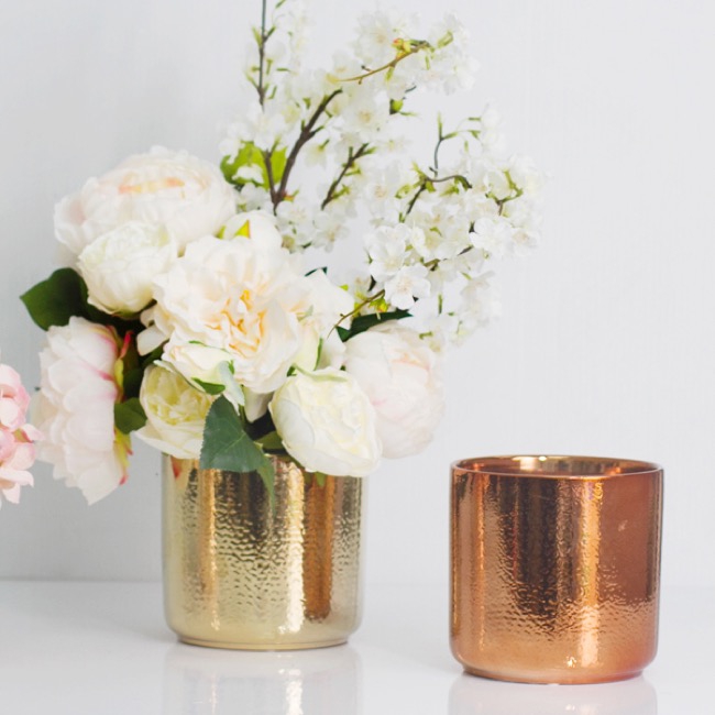 A metallic pot can flourish when displayed with the right flowers. Bring height to the arrangement with an elegant peach blossom stem, and accompany it with peony and wild rose bouquets.