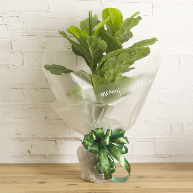 Use a frosted wrap with an elegant, metallic, green tear ribbon to display your potted plant.