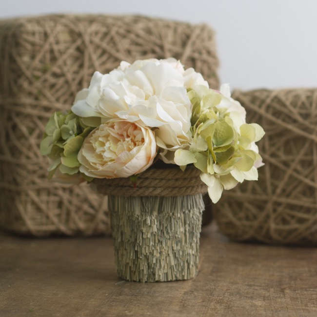 This natural grass container with rope embellishment is perfect for the outdoors and makes a perfect garden piece. It has a plastic insert which makes it suitable for flower arrangements.