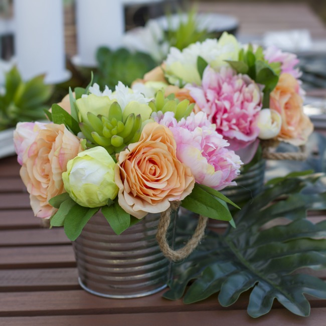 Pretty peonies, succulents and tinware has turned simple arrangement into a floral art, worthy of chic and tropical themed events.