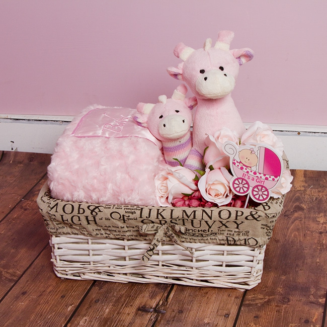 This is such an adorable baby gift. Simply Willow storage basket filled with all thinks pink. Thomas Giraffe with matching rattle, who also comes in blue. Pop in some pretty pink roses, pink hydrangea popcorn and cute "It's a Girl" pick.