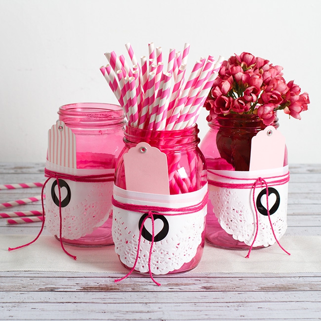 Grouped bright pink Mason Jars embellished with a doily, wrapped in pink twine and gift tag make a delightful table decoration for your next event. Pop in some striped straws and a few popcorn hydrangeas for a vintage inspired theme.