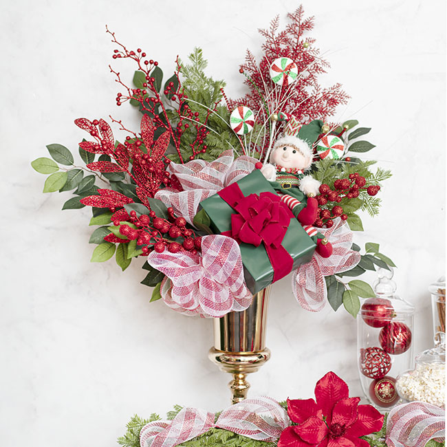 Create this playful Christmas Urn Arrangement by combining an assortment of red berry & fern sprays, candy cane sprays, a pretty gift, and a cheeky Christmas Elf. Finish the look by adding some lush mesh bows, and there you have it, a magnificent decorative accent for your home décor or event space.