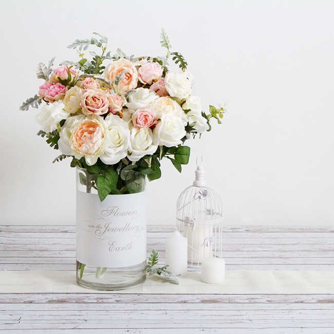 Blush pink and white roses in glass cylinder vase with decal print and small white birdcage with candles will look picture perfect as a table centrepiece.