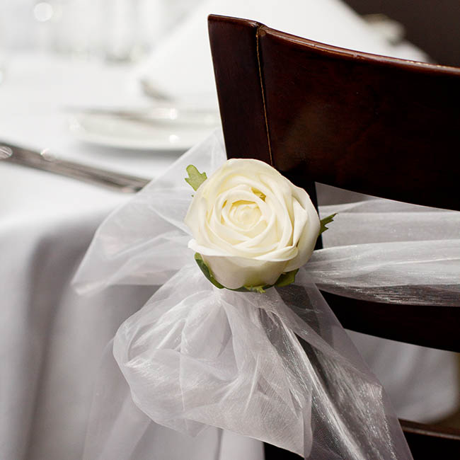 Decorate your chairs with beautiful organza ribbon and flowers, it will finish the look at your event.