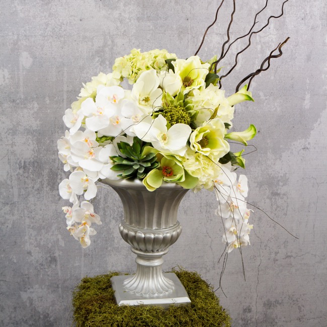 Don't underestimate the power of working a silver urn with a lush white and green arrangement - almost ethereal and definetely beautiful.