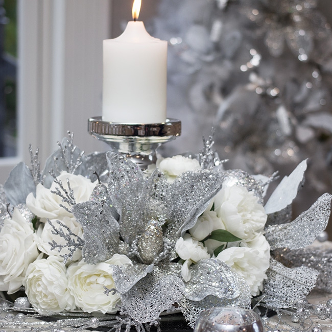 Up close and personal, silver flowers demands attention with its glitter embellishments and large glistening petals. Perfect embelishment for your candleholder.